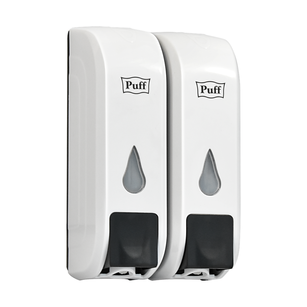 Дозатор для жидкого мыла пластиковый puff-8108. Цвет: белый с черной кнопкой. Объем: 350 + 350 мл. Доза с одним касанием: 1 мл.
