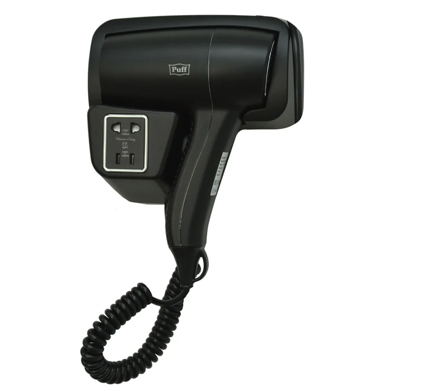 Фен для волос настенный "Puff-1201ВlB", черный, с доп розеткой