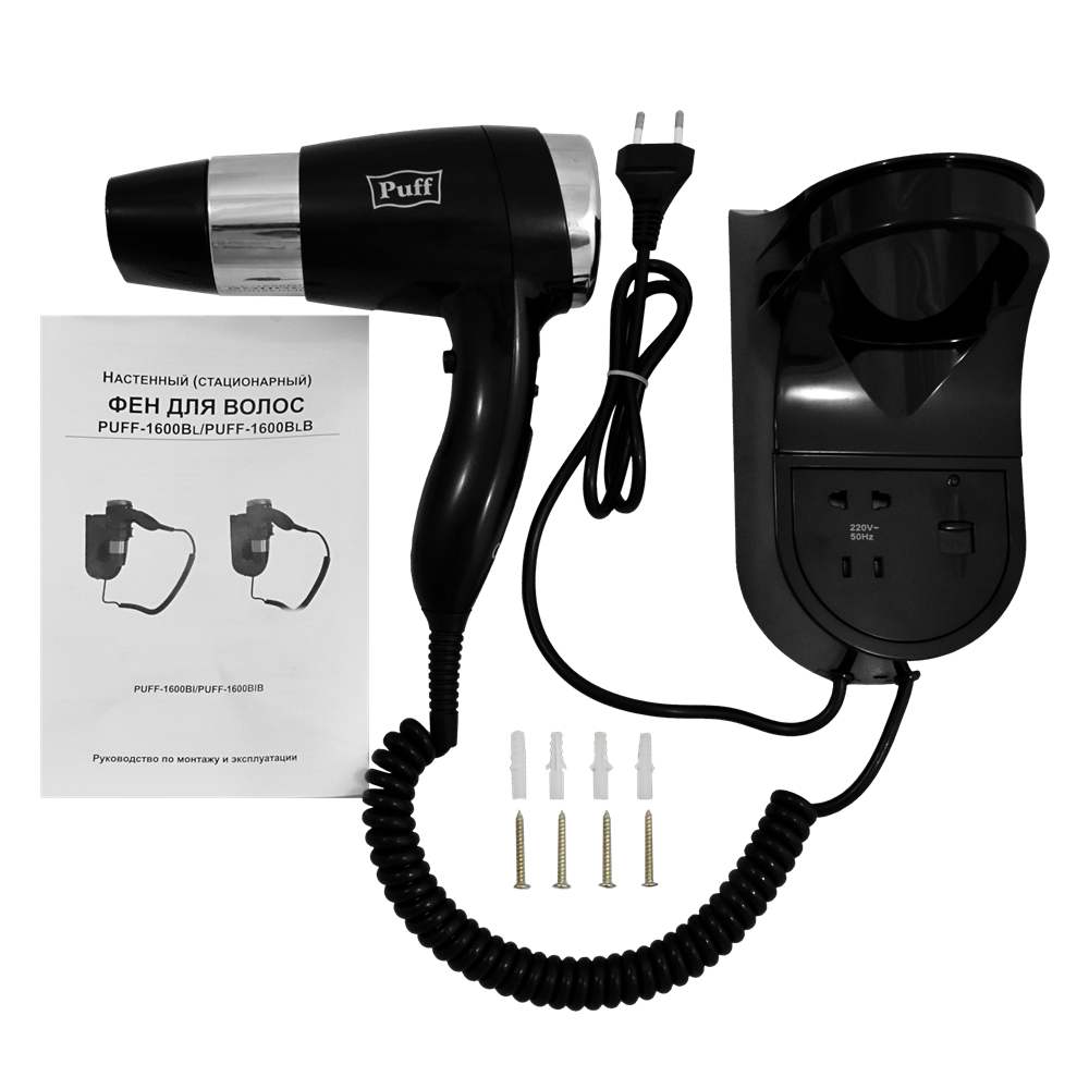 Фен для волос настенный "Puff-1600ВlB", черный, 1,6 кВт, с розеткой