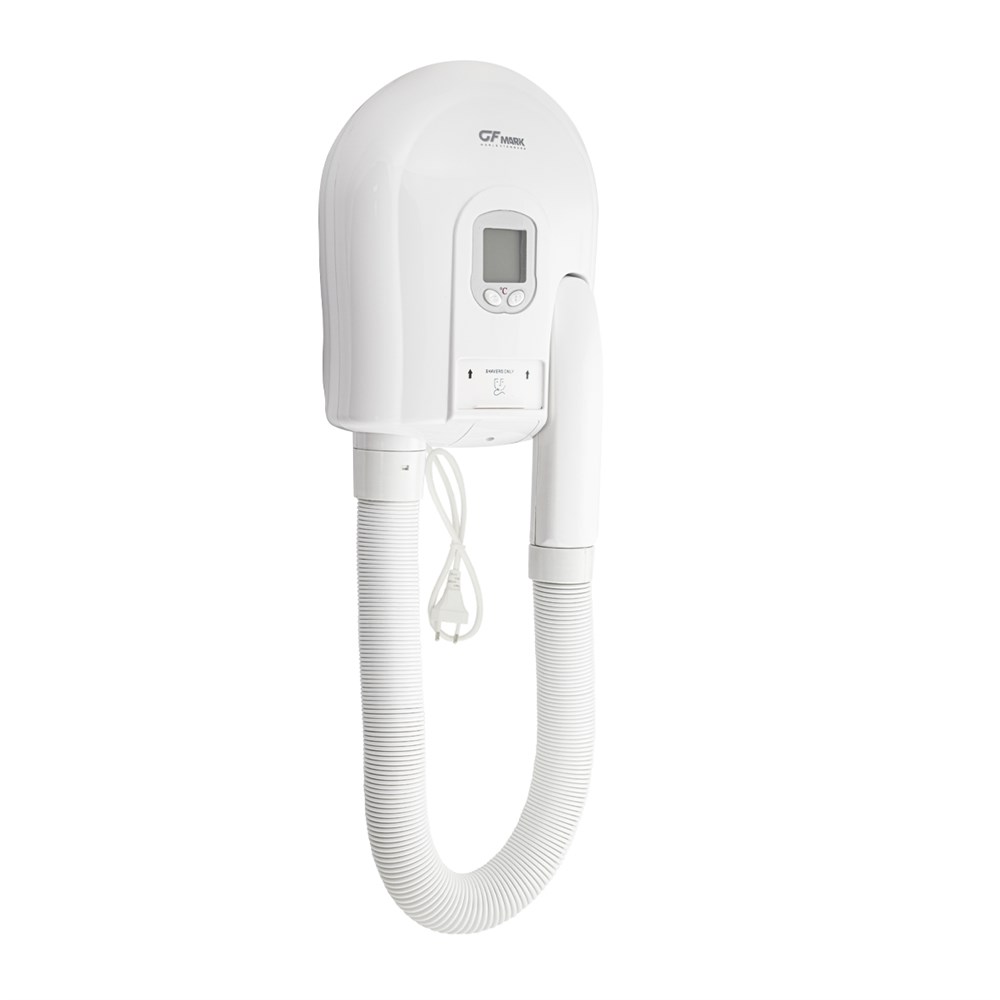 Фен для волос профессиональный, супермощный в ванную комнату с гибким шлангом, с розеткой для бритвы. Идеально подходит для установки в гостиницах, бассейнах, фитнес-клубах, в раздевалках складских и производственных комплексов. Так же может использоваться в личных ванных комнатах. Электрический фен позволяет комфортно и быстро высушить волосы после душа. Настенный держатель дает возможность хранить электроприбор в ванной комнате. Материал корпуса выполнен из белого высокопрочного пластика АБС, устойчивого к механическим повреждениям, перепадам температуры и коррозии. Поэтому электроприбор подходит не только для домашнего, но и для общественного использования – бассейны, сауны, душевые в спортивных залах. Благодаря небольшому весу феном удобно пользоваться. Габаритные размеры: высота блока 260 мм, ширина блока 200 мм, глубина блока 100 мм, диаметр фена 45 мм, длина шнура розетки 770 мм, длина пружинного гибкого шланга - 770 мм. Вес - 2,4 кг, объем - 0,01185 м3. Две функциональные кнопки позволяют регулироват