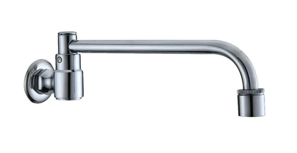 Стационарный металлический (латунь) излив со встроенным вентилем и шаровым шарниром. Хромированная поверхность.