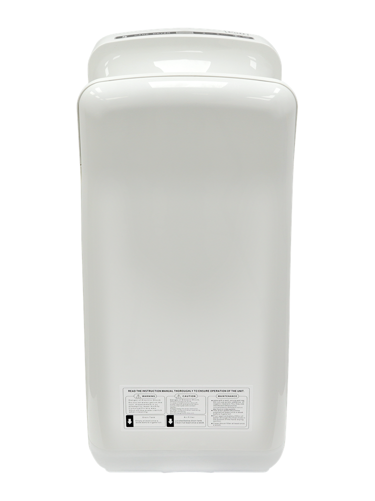Осушение рук осуществляется за счет двух узконаправленных быстрых потоков воздуха. При использовании такого типа электрополотенца, сушка рук занимает от 5 до 7 сек. Данная модель снабжена переключателем холодный-горячий, что дает возможность использовать холодный воздух (при мощности устройства 900 Вт.) или горячий воздух (при мощности устройства в 2000 Вт.). Влага с рук собирается в каплесборнике объемом 0.5 л, которую периодически необходимо опустошать (это не требует специальных навыков). Материал сушилки Puff-8878B термостойкий пластик, толщиной 3 мм.