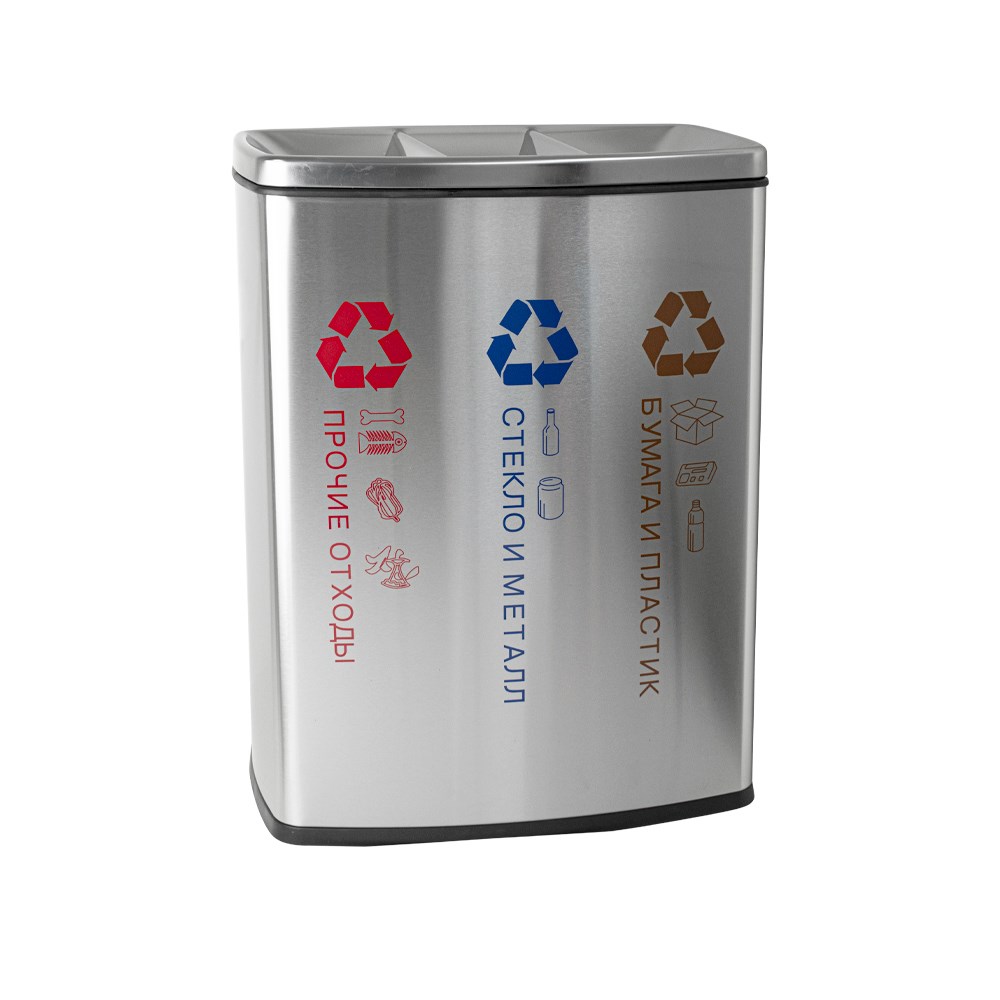 Урна для раздельного сбора мусора, 3 секции, оснащена оцинкованным гигиеническим контейнером - 3 шт, с металлической ручкой для переноса. Отличное решение для утилизации мелкого бытового мусора, изготовлено из устойчивой к коррозии, из нержавеющей стали марки SUS 410. Толщина металла 0,8 мм, объем 140 л. Габаритный размер: высота 780 мм, ширина 580 мм, глубина 320 мм. Нескользящая пластиковая основа ведра предотвращает повреждение пола. Вес - 15,500 кг, объём - 0,18000 м3.