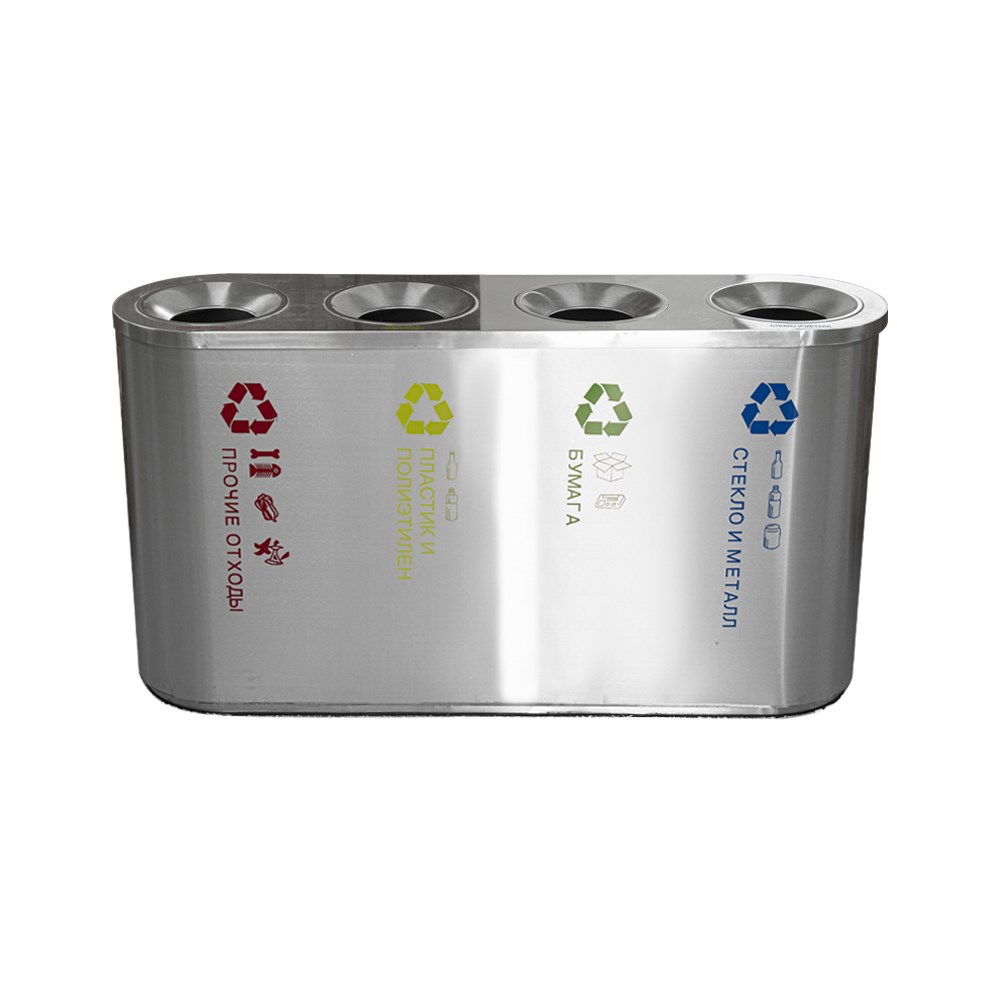 Урна для РАЗДЕЛЬНОГО сбора мусора, 4 СЕКЦИИ, из нержавеющей стали марки SUS 410, на 320 л, толщина 0,8 мм, цвет САТИН.